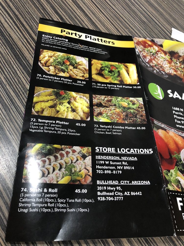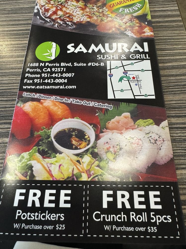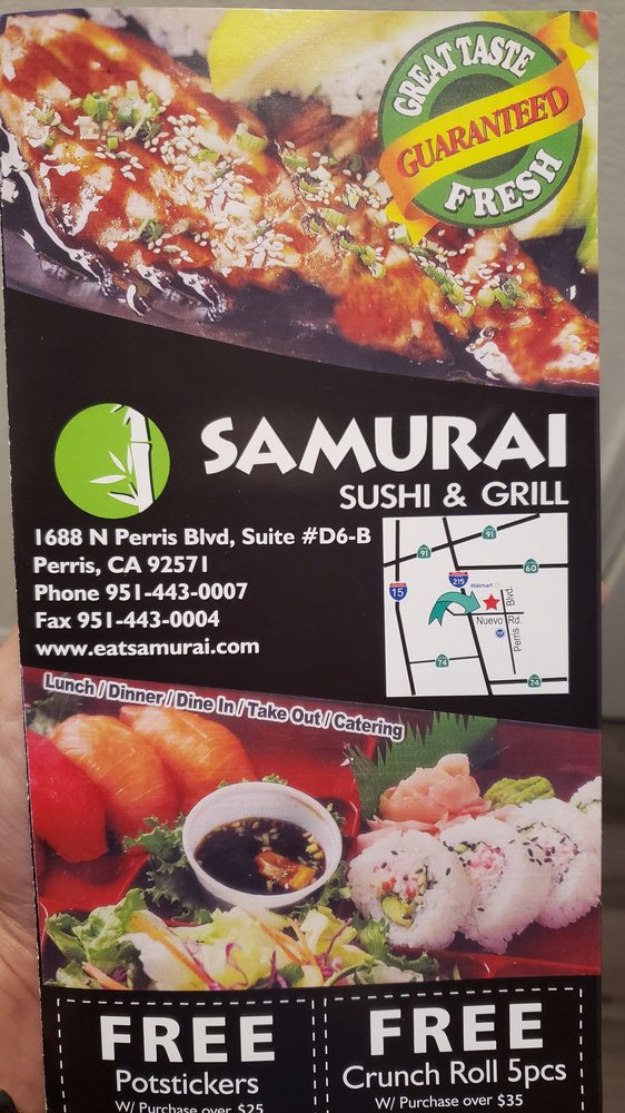 Samurai Sushi & Grill in Perris, CA offers a wide range of sushi and grill options. With options for delivery, reservations, and vegan and vegetarian choices, this casual spot is great for groups, families, and even kids. Customers praise the friendly staff and abundance of food, with favorites like the Mexican roll, shrimp tempura roll, and crush roll. The menu features fresh fish and a variety of sushi rolls, including the Las Vegas roll, crunch roll, jalapeƱo bomb, and more. Prices are reasonable, and the service is efficient and accommodating. If you're in the mood for a quick and satisfying sushi lunch, Samurai Sushi & Grill is a solid choice.